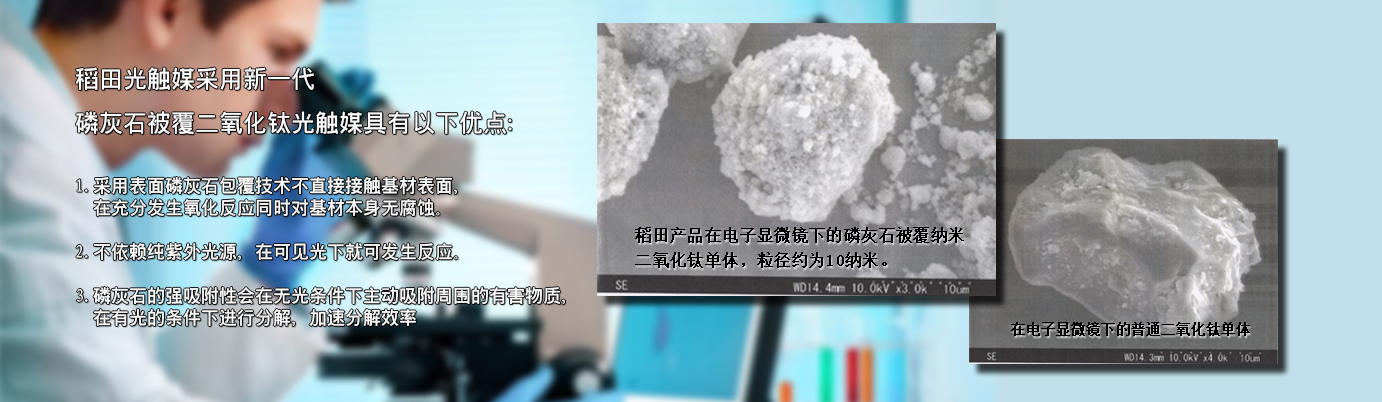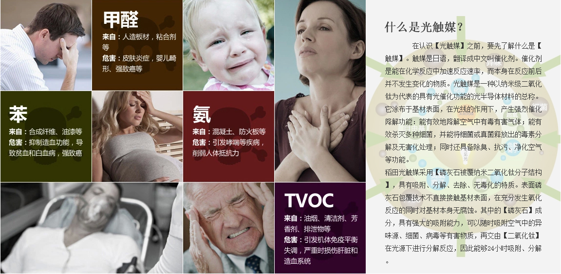 在認識【光觸媒】之前,要先了解什么是【觸媒】。觸媒是日語,翻譯成中文叫催化劑。催化劑是能在化學反應(yīng)中加速反應(yīng)速率,而本身在反應(yīng)前后并不發(fā)生變化的物質(zhì)。光觸媒是一種以納米級二氧化鈦為代表的具有光催化功能的光半導體材料的總稱。它涂布于基材表面,在光線的作用下,產(chǎn)生強烈催化降解功能:能有效地降解空氣中有毒有害氣體;能有效殺滅多種細菌,并能將細菌或真菌釋放出的毒素分解及無害化處理;同時還具備除臭、抗污、凈化空氣等功能。 稻田光觸媒采用【磷灰石被覆納米二氧化鈦分子結(jié)構(gòu)】,具有吸附、分解、去除、無毒化的特質(zhì)。表面磷灰石包覆技術(shù)不直接接觸基材表面,在充分發(fā)生氧化反應(yīng)的同時對基材本身無腐蝕。其中的【磷灰石】成分,具有強大的吸附能力,可以隨時吸附空氣中的異味源、細菌、病毒等有害物質(zhì),再交由【二氧化鈦】在光源下進行分解反應(yīng),因此能夠24小時吸附、分解